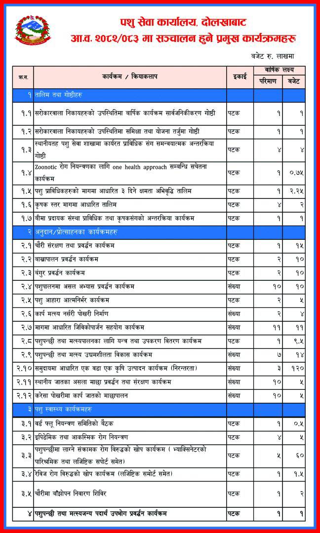 जिल्ला पशु सेवा कार्यालय बि.सं. २०२७ सालमा पशु चिकित्सालय जिरी, दोलाखाको नामबाट स्थापना भई प्रारम्भमा जिरी कृषि केन्द्र संग सयुंक्त रुपमा रहि दोलखा जिल्ला र रामेछाप जिल्लामा सेवा पुराउदै आइरेहेकोमा बि.सं. २०३६ साल देखि पशु विकास तथा पशु स्वास्थ्य विभाग अन्तर्गत रही समन्यात्मक पशु विकास कार्यक्रम र पशु चिकित्सालयको नामबाट यस जिल्लामा पशुपन्छीको उपचार तथा विकास सम्बन्धी कार्यक्रम संचालन गर्दै आइरहेकोमा बि.सं. २०३९ साल देखि जिरी कृषि केन्द्रबाट अलग भई बि.सं. २०४२-२०४३ साल देखि समन्यात्मक पशु विकास कार्यक्रम र पशु चिकित्सालय दुईवटै कार्यक्रम एकै साथ संचालन हुने गरि जिल्ला पशु सेवा शाखामा समाबेश भयो | पशु सेवा कार्यक्रम लाई समय सापेक्ष भरपर्दो बनाउन तत्कालिन श्री ५ को सरकारको निर्णय अनुसार यस कार्यालय लाई बि.सं. २०४४ श्रावण ८ गते जिरीबाट सारेर यस जिल्ला को सदरमुकाम चरिकोटमा स्थापना गरियो | तत्तपश्चात आ.व. २०४९ देखि २०५० सम्म उक्त पशु सेवा साखा लगायत कृषि विकास शाखालाई एउटैमा गाभि जिल्ला कृषि विकास कार्यालय अन्तर्गत पशु सेवा शाखाको संरचनामा परिणत भयो | करिब ३ वर्ष पश्चात कार्यालय आ.व. २०५२/०५३ मा छुट्टिई फेरी जिल्ला पशु सेवा कार्यालय को नाममा खडा भयो र पशु स्वास्थ्य तथा पशु विकास कार्यक्रमहरु, पशु सेव Read More
